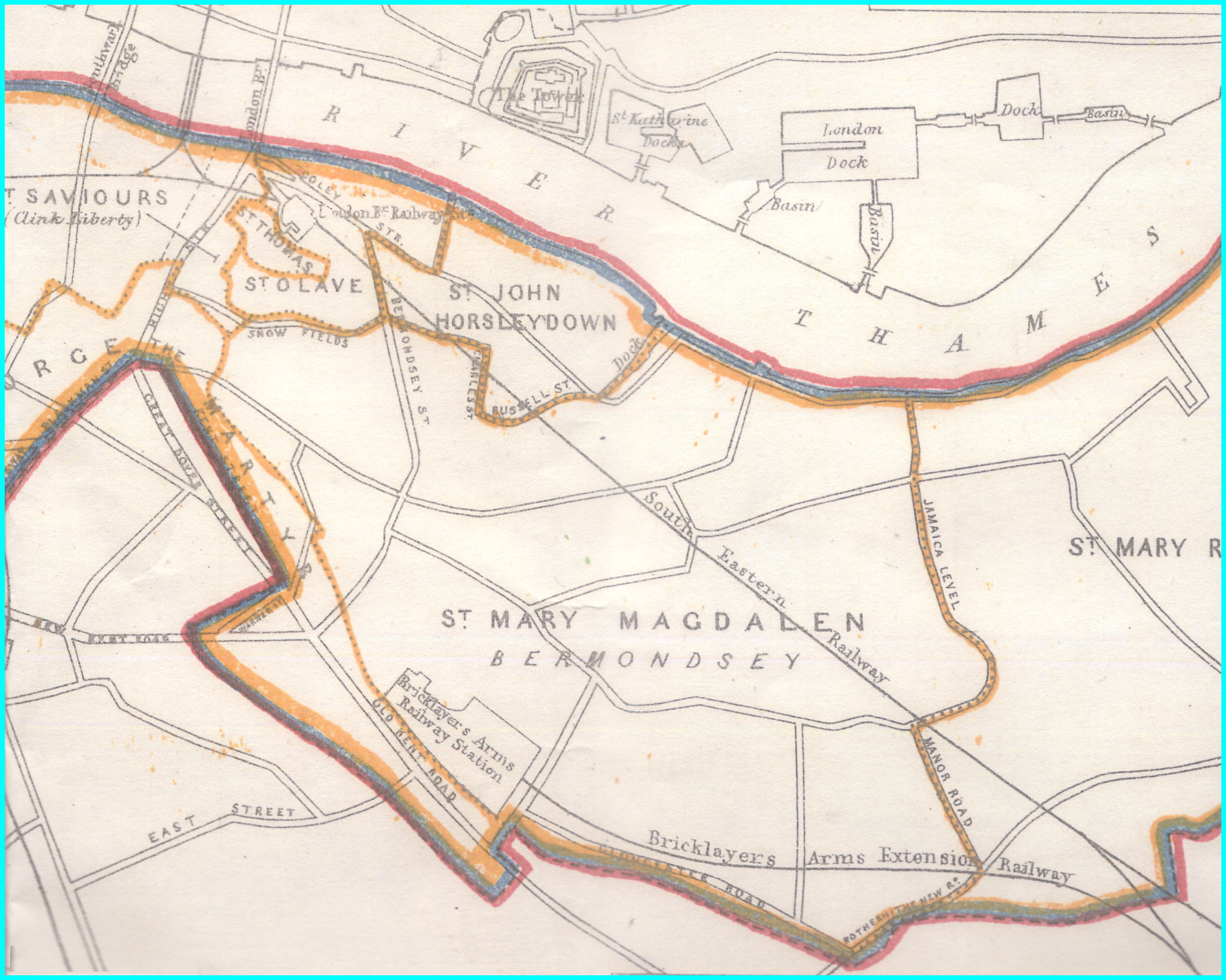 The southern boundary is behind but not along the Old Kent Road, following along the centre of what is now Marcia Road off Dunton Road then westerly behind Tabard Street (‘Kent Street’) crossing property boundaries but thence along Tennis Street to a northern border as Snowsfields crossing Bermondsey Street to Crucifix Lane (now under the railway viaduct) along modern Roper Lane (‘Charles Street’) to the eastern side of Tanner Street (‘Russell Street’) ie from what is now Tower Bridge Road to the junction with the St Saviour’s Dockhead. Thence as a northern border along the Thames to West Lane then along it crossing Jamaica Road forming the eastern border along Southwark Park Road (‘Jamaica Level’) and thence to Galleywall Road (‘Manor Road’) continuing south to and along Rotherhithe New Road to its junction with Rolls Road (‘Gloucester Road’) along that to Dunton Road.