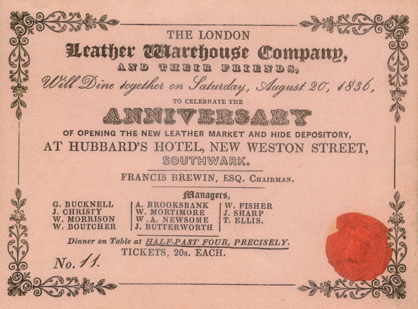 During the mid-summer period the company holds its annual meeting for the swearing in of the three senior officers and the Assistants and any new members/ Apprentices and Freemen. The date has to be on or from 14 days after midsummer’s day (24th June, Nativity of John the Baptist). The three seniors are ‘Master, Upper Warden and Warden’ and with them the Assistants form ‘The Court’. This concurs with the Charter §3. This is followed by a feast. As noted already the Exchange was combined with a Club and there are numerous reports of its being the centre of the trades social activities. However, an interesting survival in the Southwark Archives is a ticket for a dinner held to celebrate an anniversary of the opening of ‘The New Leather Market and Hide Depository’ by the Directors and proprietors of the ‘London Leather Warehouse Company’ which was the formal corporate owner of the facilities. Apart from the list of Directors on the ticket which includes the notable names, Boutcher, Mortimore and Fisher, the tariff of the feast is 20 shillings, ie £1 per head, this is in 1836 when working men would not earn that a week.